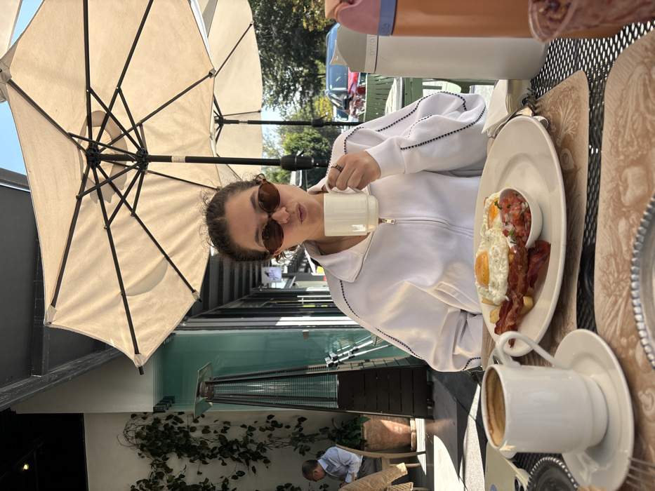 A young woman sits at a table outdoors under an umbrella. She wears sunglasses and a white track jacket, holding a white mug to her lips. On the table, a plate of fried eggs, bacon, and salsa sits next to another white mug with coffee. In the background, a man in a light-colored shirt and pants is seated. Greenery and a tall heater are also visible. The scene suggests a casual brunch or breakfast setting.