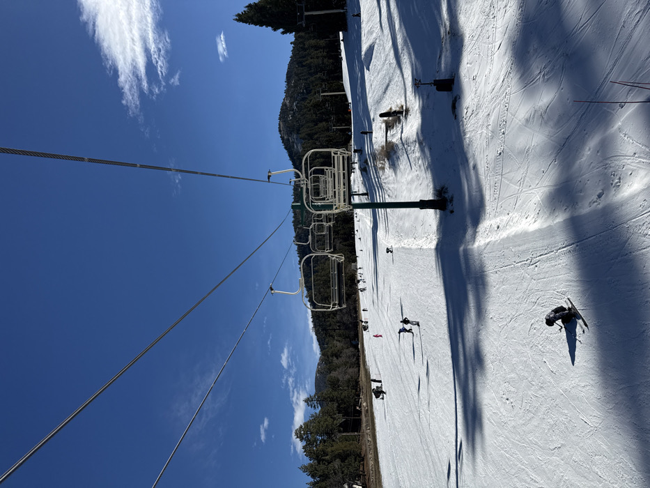 A ski lift with empty chairs ascends a snowy slope under a clear blue sky with wispy clouds. Sparse trees line the edge of the ski run, where skiers and snowboarders dot the white expanse. Shadows cast by the lift's support structures stretch across the snow. The scene conveys a sunny day at a ski resort with a relaxed, open atmosphere.