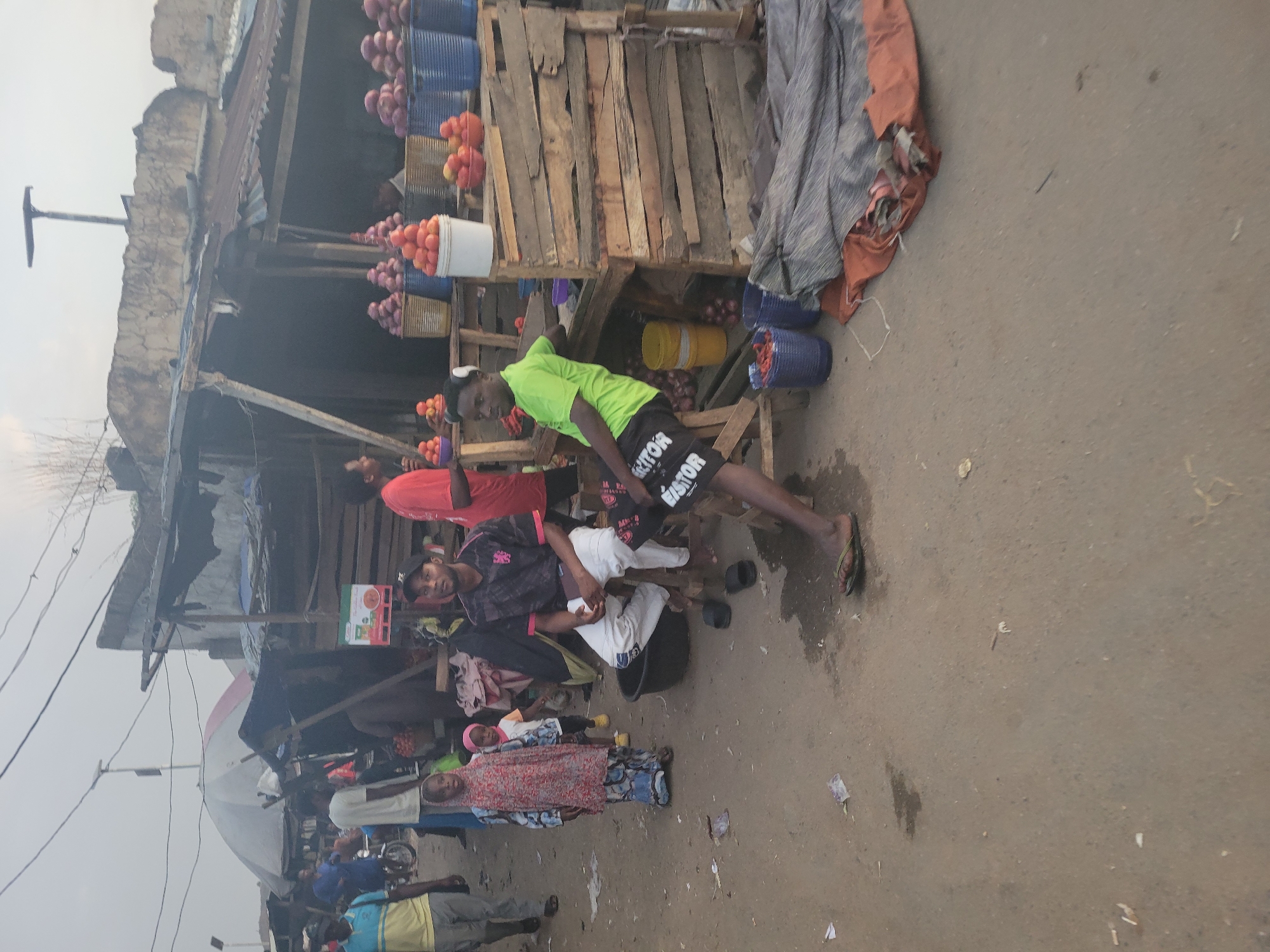 scene in what appears to be a market or roadside vending area, presumably in Madalla, Nigeria, based on the prompt