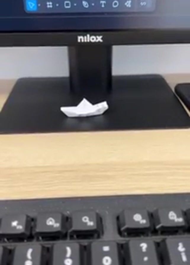 The scene is a close-up shot of a desk setup. A black keyboard is positioned in the foreground. Behind it is a wooden-patterned desk. On the desk, there is a small, white paper boat with writing visible on its side. Behind the boat is a black computer monitor, which has a Nilox logo at the bottom. The monitor displays what seems to be an editing software interface. The overall lighting is neutral and the focus is sharp on the paper boat.