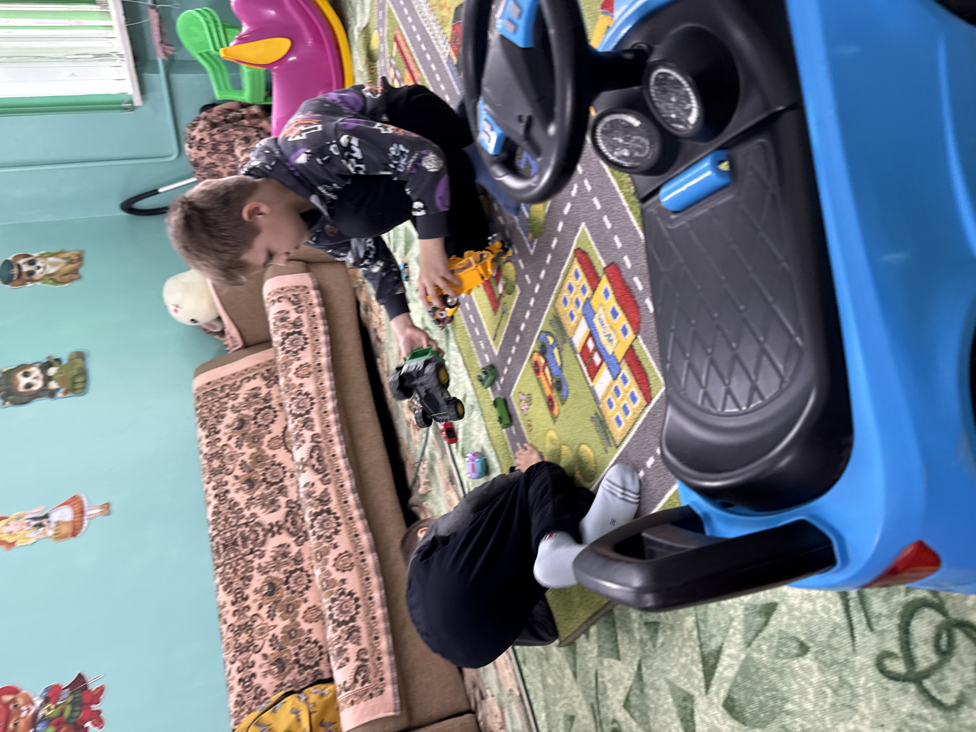 A photograph depicts two children playing on a toy car mat indoors. The location is inferred as Anapa, Russia, based on metadata assumptions. Two young children are present. One child, wearing a black patterned shirt and black pants, kneels and reaches towards toy cars on the mat. The second child, dressed in all black with grey-striped socks, is positioned closer to a large, blue toy car. The setting is indoors, with light-blue painted walls and a patterned, green and white rug. The children are on a play mat depicting roads and buildings. A beige couch with a patterned throw lies adjacent to the mat. Stickers and wall decorations are visible on the wall. A pink and green toy is in the background. The children are engaged in playing with toy vehicles on the mat, suggesting imaginative play. The large blue toy car dominates a portion of the image.