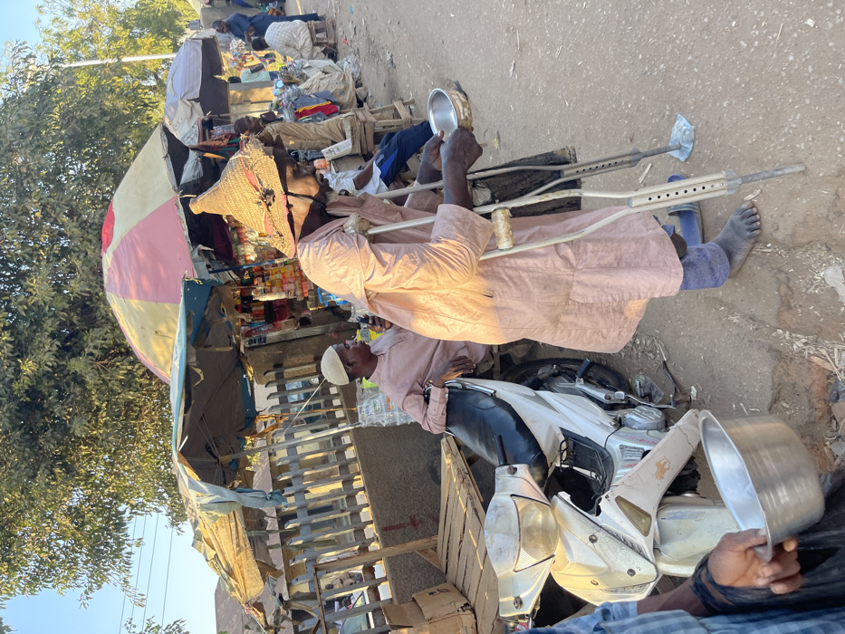 This image depicts a bustling roadside scene in Zaria, Nigeria, under clear daylight. In the foreground, an elderly individual with dark skin, wearing a light peach-colored traditional long-sleeved garment and a conical straw hat, stands with two forearm crutches. They are holding a small, tarnished metal bowl in their right hand. Their feet are bare, with a single blue slipper on the left foot near the ground. To the left, a white and silver scooter motorcycle is parked, showing signs of wear and a lion decal on its side panel. Behind the scooter, a younger man with dark skin, wearing a white skullcap and a light peach-colored traditional top, sits on a wooden bench, appearing to look at an object in his hands. He is positioned in front of a makeshift wooden fence. The background features several roadside stalls constructed with corrugated metal and covered by large umbrellas; one umbrella is distinctively red and yellow striped. These stalls display numerous packaged goods, including snacks and drinks. Other individuals are visible in the background, sitting or standing near the stalls. The ground is unpaved, consisting of reddish-brown dirt. Overhead, trees with green foliage are visible, and power lines traverse the upper left of the frame. The overall impression is that of a busy street or market area.
