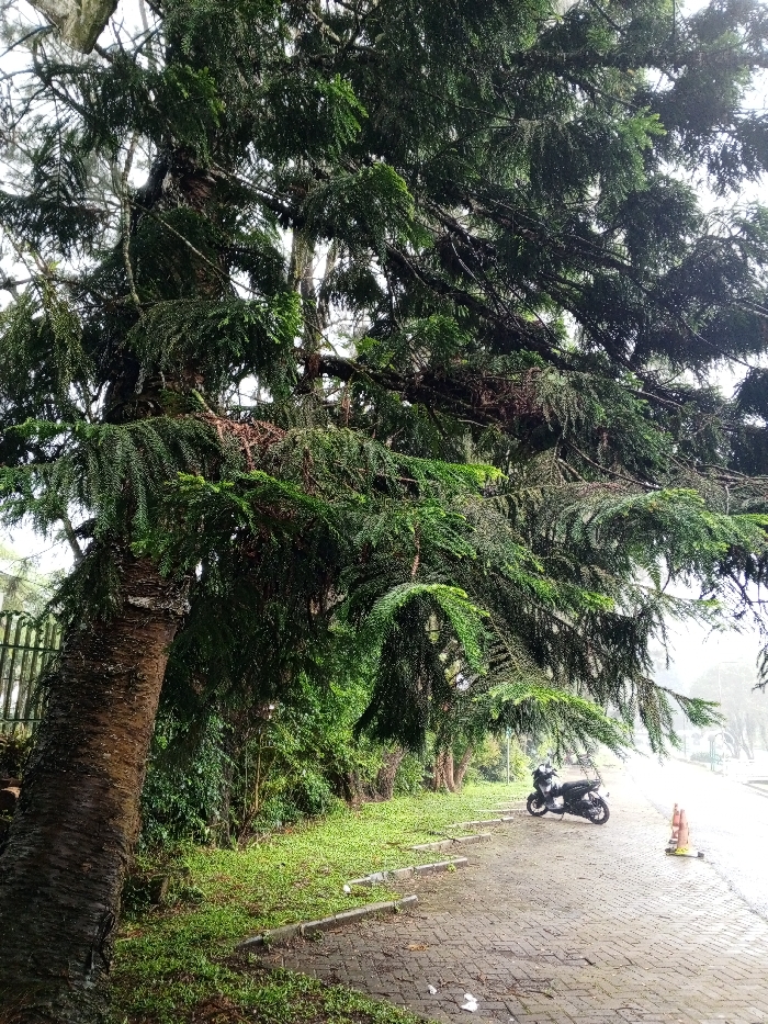 A large, mature tree with dense, drooping foliage dominates the scene. Its textured trunk is prominent on the left. The tree provides shade over a pathway lined with green grass and occasional concrete slabs. A parked motorbike sits on the paved section, and a traffic cone is nearby. In the background, vegetation blurs into the mist.