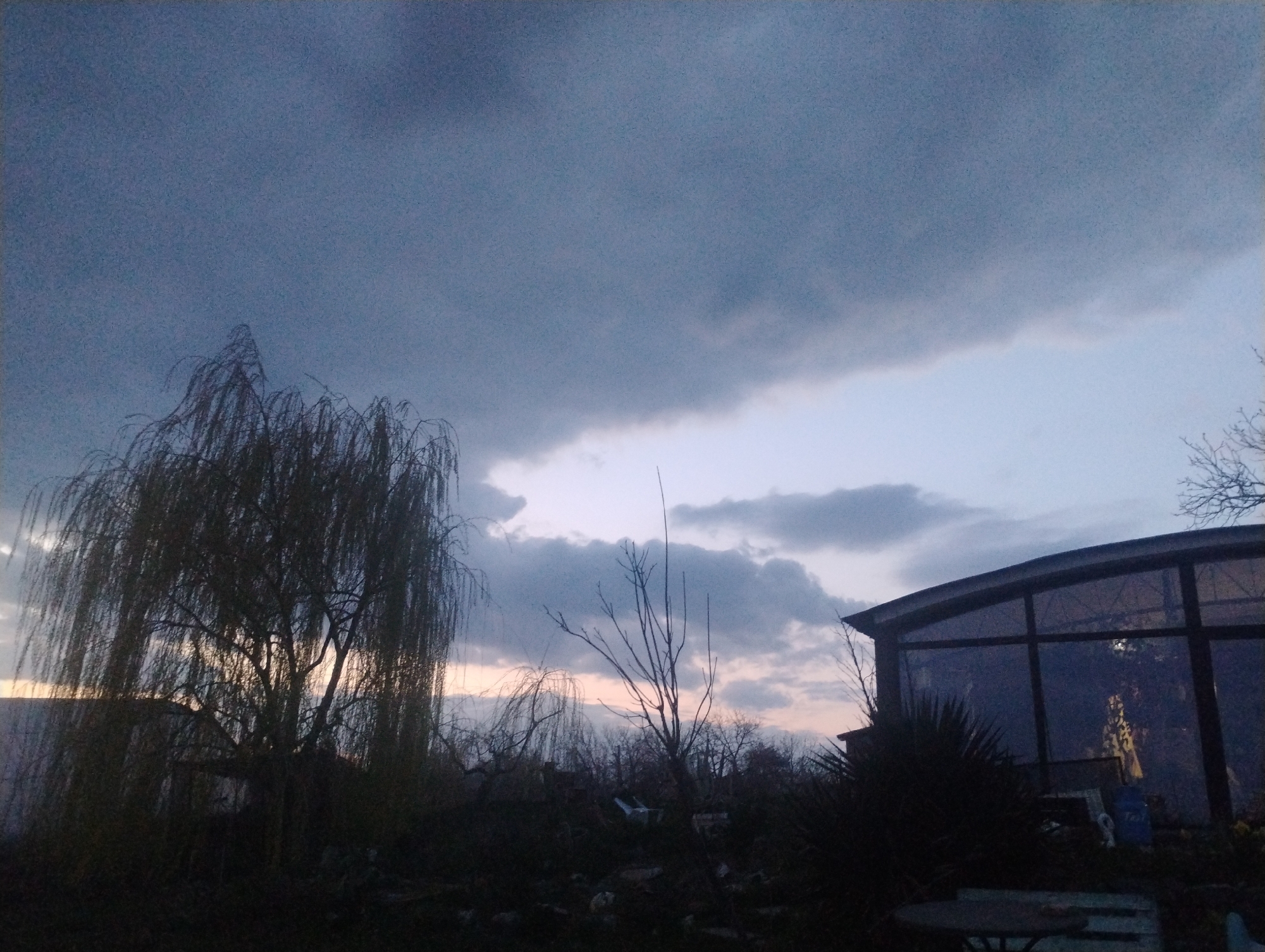 This image depicts an outdoor twilight scene, presumably within a residential or garden area in the City of Trakiya, Bulgaria. The sky occupies the upper two-thirds of the frame, characterized by extensive, dark, overcast clouds in the upper portion. Below this primary cloud mass, a horizontal band of lighter sky is visible, exhibiting gradients from pale blue to faint pinkish-orange along the horizon, indicative of either dusk or dawn. In the left midground, a large weeping willow tree stands silhouetted against the lighter sky, its characteristic pendulous branches creating a dense, dark form. Further right, several other deciduous trees or large shrubs with bare branches are scattered, also appearing as dark silhouettes. On the right side of the image, a building with an arched roof section and multiple large, framed glass panels or windows is present. The windows reflect the subdued light from the sky and reveal indistinct internal objects, including what appears to be an open outdoor umbrella and several cylindrical containers, possibly blue. A dark, spiky-leaved plant partially obscures the lower exterior of this building. In the extreme lower-right foreground, a round outdoor table with a lighter tabletop is partially visible, accompanied by two chairs, all rendered in dark silhouette. The ground throughout the foreground and midground is largely indistinct due to low light, appearing as a dark, irregular expanse. No individuals or discernible human activity are present.