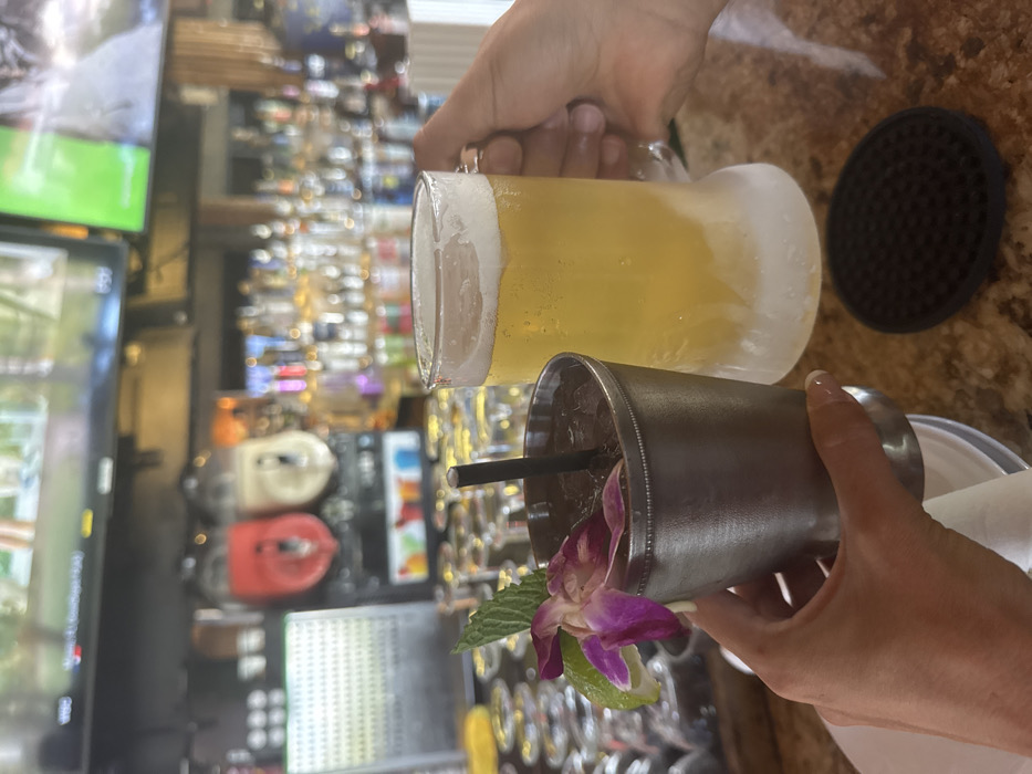 The image depicts two hands holding alcoholic beverages at a bar counter in Hallandale Beach, United States of America. A left hand, featuring manicured nails, grips a silver-colored metal cup filled with a dark liquid, ice, and a black straw. This drink is garnished with a purple orchid flower, a lime wedge, and a mint sprig. A right hand, displaying a ring on the fourth finger, holds a frosted glass mug containing a golden-yellow beer topped with a layer of white foam. Condensation is visible on the exterior of the beer mug. The drinks rest on a mottled brown and tan bar top. In the blurred background, a fully stocked bar is evident, featuring numerous liquor bottles arranged on shelves, two commercial frozen drink machines (one with red contents, one with light-colored contents), and two wall-mounted flat-screen televisions displaying indistinct outdoor imagery. A black, circular, textured coaster is visible on the bar counter to the right.