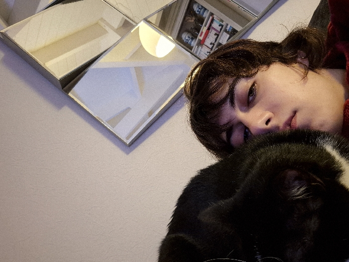 A young person with dark hair and fair skin rests their face against a black cat with a white patch. The individual wears a red garment. Above them, a set of square mirrors is affixed to a light-colored wall, reflecting parts of a bookshelf. The lighting appears dim, casting shadows across the scene. The picture is taken from an unusual angle, looking upwards towards the subject.