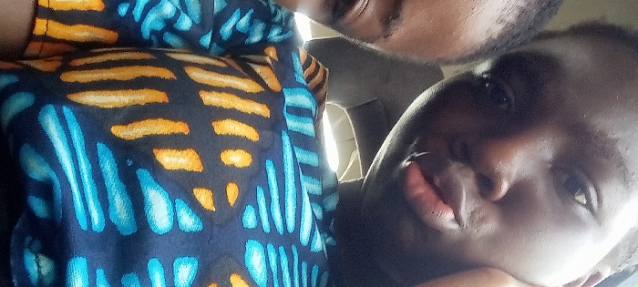 Two people pose close together in this slightly tilted selfie. The individual on the right has dark skin and looks directly at the camera with a slight smile. Parts of the face of the person on the left, who also has dark skin, can be seen above the first individual's head. The person on the left is wearing a brightly patterned fabric in hues of blue and yellow on a dark background. The background behind them is blurry and indistinct.