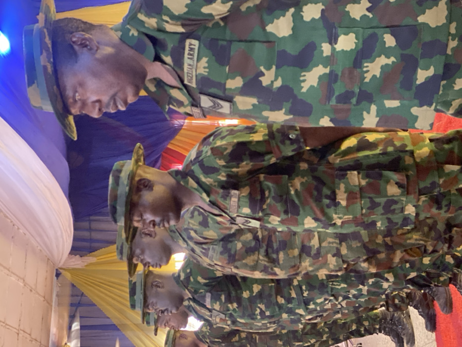 The image depicts at least six male personnel of the Nigerian Army standing in formation indoors, likely at an event or ceremony in Kachia, Nigeria