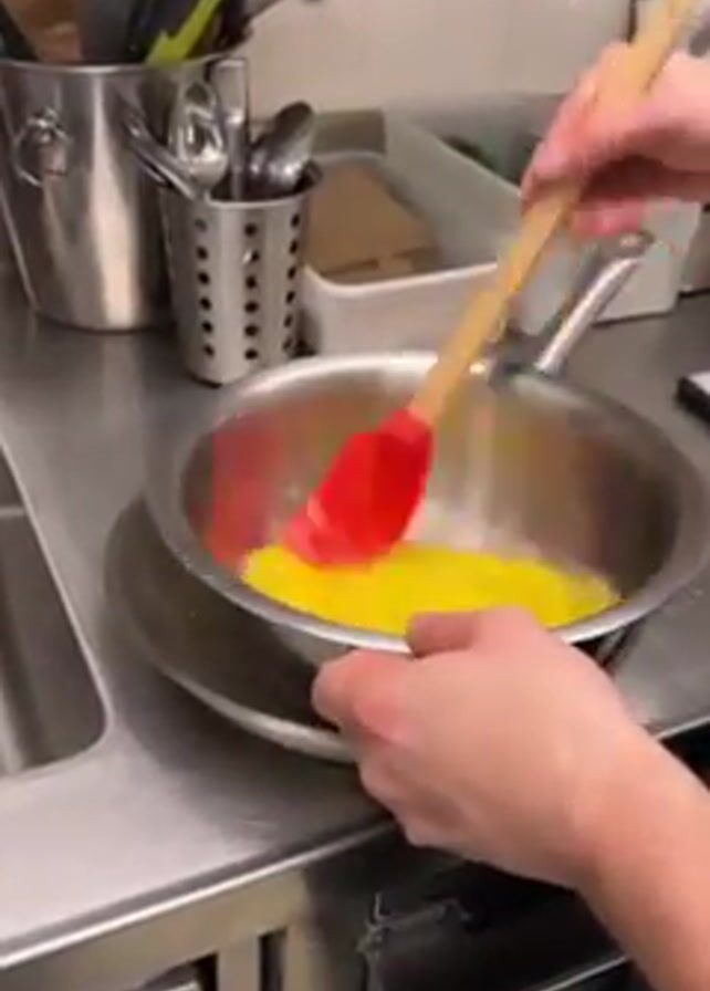 A chef in a navy-blue shirt is vigorously whisking eggs in a stainless-steel bowl with a red spatula attached to a wooden handle, placed on a stainless-steel countertop