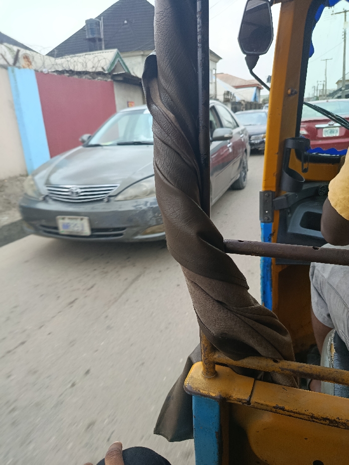 The scene depicts a street in Warri, Nigeria, observed from the interior of a yellow and blue commercial tricycle (keke napep). In the immediate foreground, a worn, brown, leather-like material is wrapped around a vertical metal support bar on the left. Below this, rusted sections of the tricycle's yellow and blue painted metal frame are visible. A person's knee, covered by dark fabric, is partially visible in the bottom-left. To the right, a person wearing a yellow top and grey trousers is seated within the tricycle. On the street, a grey Toyota Camry sedan, with its front facing away from the viewer, occupies the left side of the frame. Its front license plate, partially obscured, appears consistent with Nigerian vehicle registration. The vehicle's headlights exhibit hazing. Behind the Camry, a line of other vehicles, including a red sedan on the far right, suggests traffic or parked cars. The road surface is light grey asphalt or concrete. In the background, a building with a red and light blue painted wall, topped with barbed wire, stands behind the Camry. Above this wall, a house featuring a dark, pitched roof and a black water tank is visible. The sky is overcast, and utility poles with power lines are discernible in the distant background on the right.