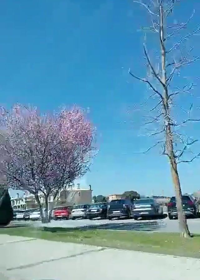 view of a residential street from inside a moving car. The sky is bright blue and the sun is out. There are several cars parked on the side of the street. There are also trees along the sidewalk, some with light pink blossoms. One person wearing an orange vest is walking across the road. There are some buildings in the background. Music is playing.
