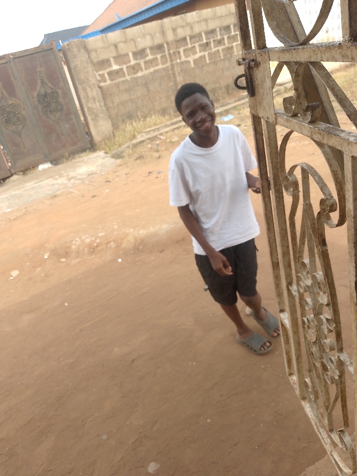 A young male, appearing to be of African descent, stands smiling directly at the camera in Agege, Nigeria