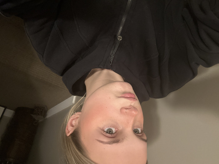 A selfie shows a woman with blonde hair, fair skin, and a piercing in her nose. She wears a black zip-up hoodie. Her eyes are light, and she has noticeable blush on her cheeks. The photo appears to be taken indoors, with a cabinet or piece of furniture visible in the background on the left side of the frame. The background wall is a neutral color. The image is somewhat rotated.