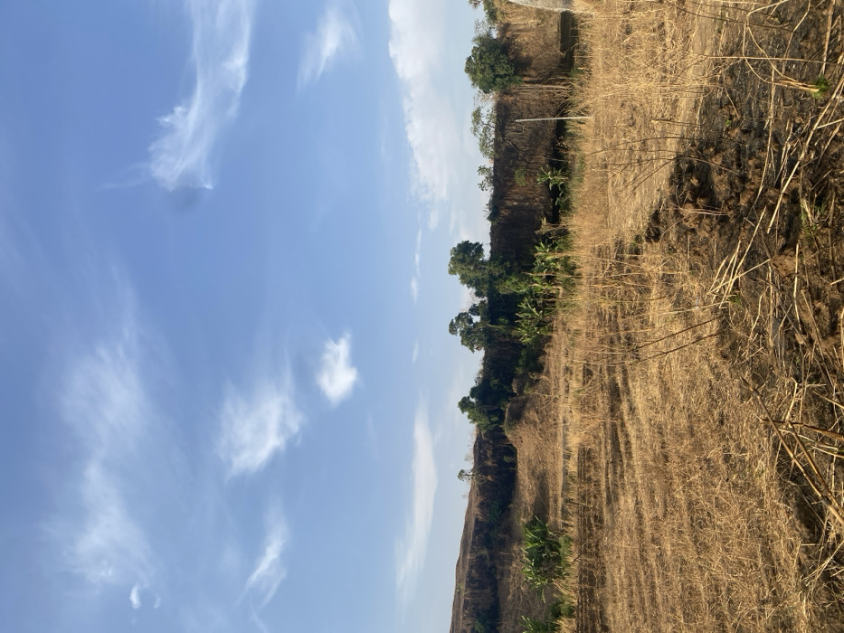 A landscape scene shows a bright blue sky with scattered cirrus clouds filling the left half. The right side depicts a stark contrast: a dry, desolate field of brown vegetation stretches towards a steep bank lined with sparse trees and greenery. A vertical orientation presents an unconventional perspective of the environment. The overall impression is one of stark beauty juxtaposed with the harshness of arid conditions.