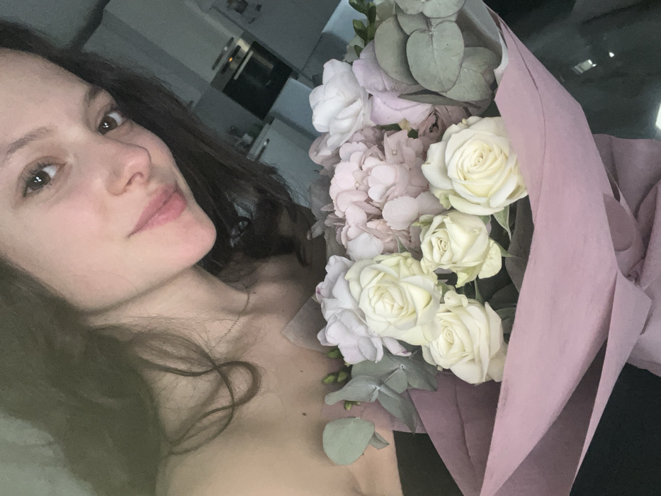- "The image is a selfie taken indoors, featuring a young adult female holding a large floral bouquet" by FM-F32v12, licensed under CC BY 4.0