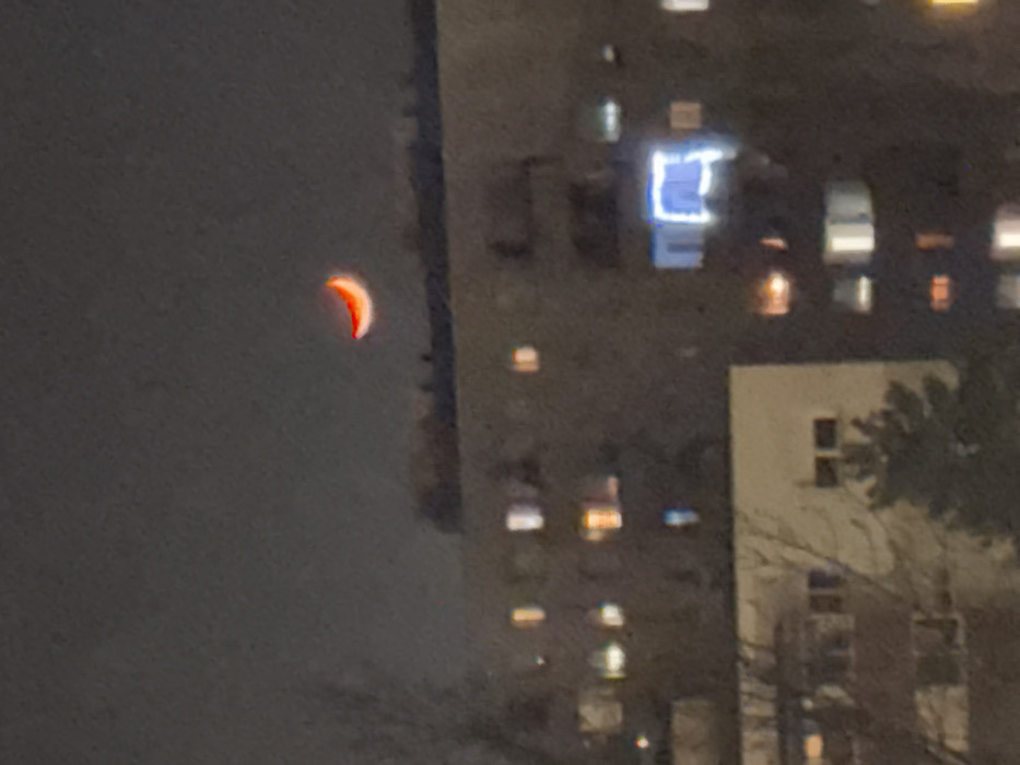 - "A blurry night scene captures a crescent moon glowing red against the dark sky, positioned to the left of a tall apartment building" by FM-pFdZm2, licensed under CC BY 4.0