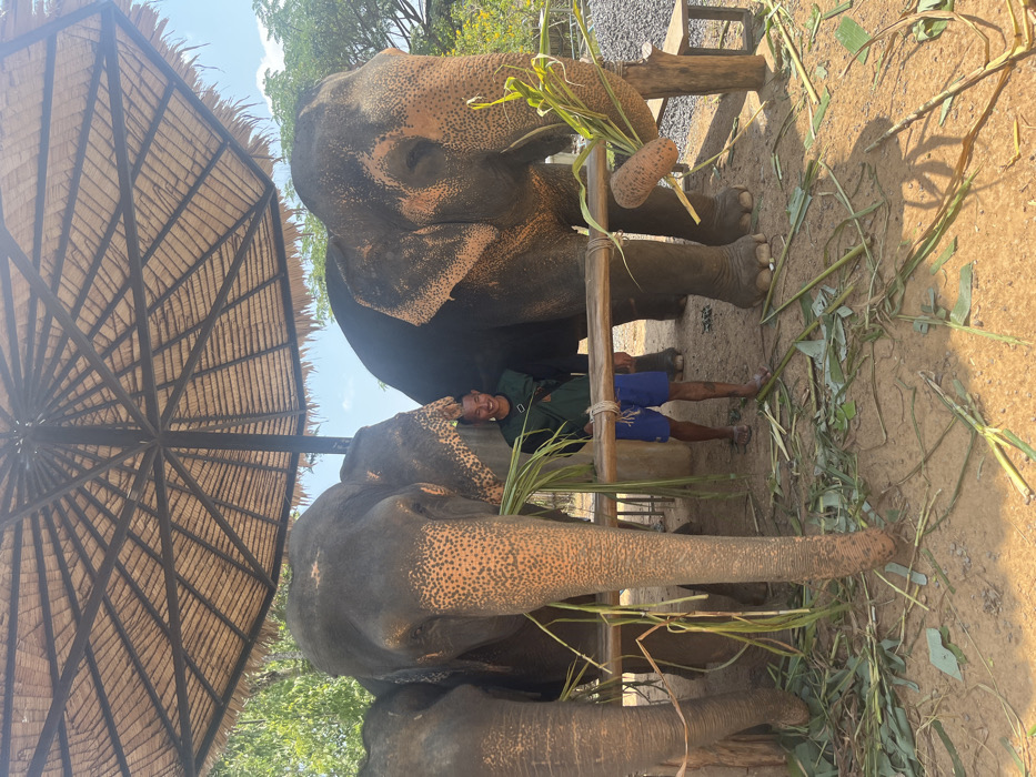 An elephant sanctuary scene shows two large, gray elephants eating green vegetation. A man wearing a green shirt and blue shorts stands between them, smiling. One elephant holds a carrot in its trunk. A thatched umbrella provides shade. The ground is dirt-covered and strewn with vegetation. Bamboo fencing encloses the feeding area.