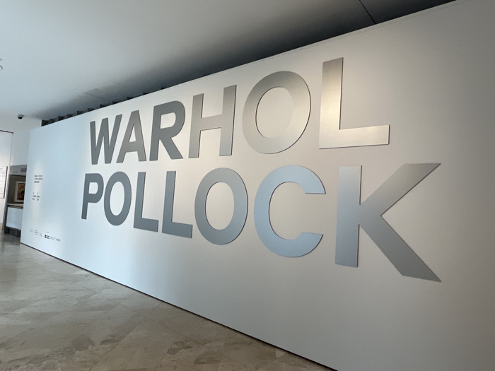 The image displays an interior view of the Fundación MAPFRE Recoletos exhibition hall in Madrid, Spain. The dominant feature is a large, white partition wall positioned at an angle, displaying two lines of prominent, raised, metallic-silver lettering. The top line reads "WARHOL," and the bottom line reads "POLLOCK." These letters possess a reflective metallic finish. To the left of this primary text, a smaller white panel on the wall contains additional black text, partially visible, including "FUNDACIÓN MAPFRE" and several logos. The floor consists of light-colored, polished marble or stone tiles. The ceiling is white, with a darker recessed channel visible at the top edge of the wall and a dome-shaped security camera mounted in the upper left corner. In the background, beyond the main wall on the left, an adjacent exhibition area is visible, featuring a framed artwork on a wall. No individuals are present in the scene.
