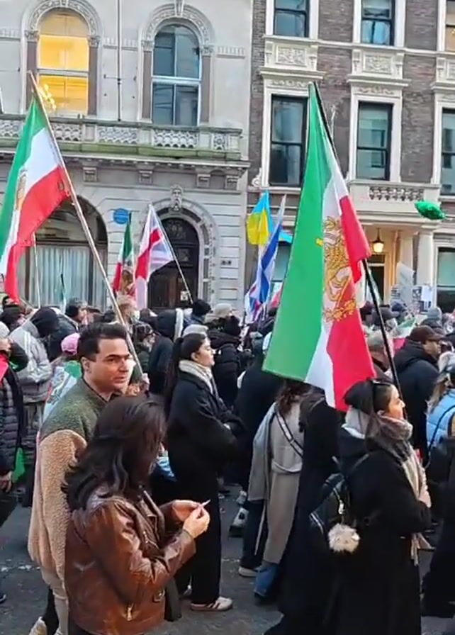 crowd of people marching in what appears to be a protest or demonstration in a city. Many participants are holding or draped in Iranian flags, some with a lion emblem. There is also a British flag visible. The protestors are moving along a street with buildings on either side. The buildings are multi-story and have a similar architectural style, featuring multiple windows. People are dressed in casual winter clothing, suggesting a cool weather environment. The scene seems to be taking place during the day. Some people are holding signs, but the text is not clear. The atmosphere appears to be active and engaged.