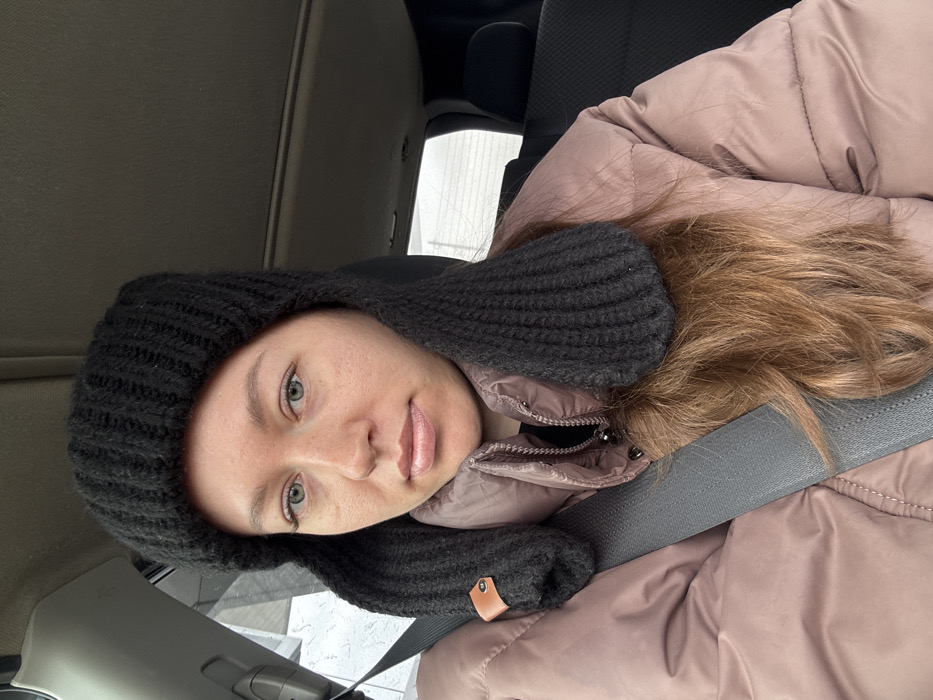 A young adult female is depicted in a front-facing image, seated and secured by a grey seatbelt within a vehicle, observed in the city of Фролы, Russia. She wears a black ribbed knitted earflap hat, which features a small brown tag with a dark rivet on the left earflap. A light pink puffer jacket covers a dark garment visible at the neckline. Her light brown hair extends below the hat and over the jacket. Her face, directed towards the camera, shows light-colored eyes and a neutral expression, with a slight sheen on her lips. The immediate environment includes a vehicle interior with a grey headliner and dark upholstery. The exterior visible through the vehicle's windows is indistinct and appears overcast or blurred.