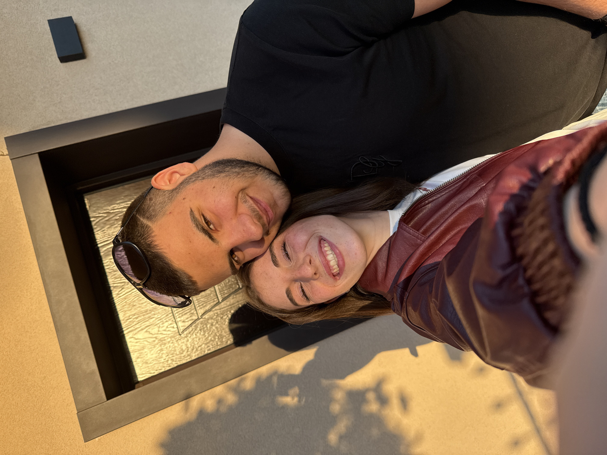 A selfie photograph shows a man and woman with their heads close together, likely taken outdoors during daytime. The man has dark hair and a beard, wearing a black t-shirt. Sunglasses are propped on his head. The woman is wearing a maroon leather jacket and has brown hair. They are both smiling. A dark rectangular object is visible in the upper left corner of the frame, possibly attached to the wall. A dark, rectangular, possibly framed object is on the left, reflecting the couple's faces and the outdoor lighting. The background surface appears to be a mix of concrete and beige painted wall, possibly outdoors. The location is undetermined, and the claim about Trud, Bulgaria, is unsubstantiated.