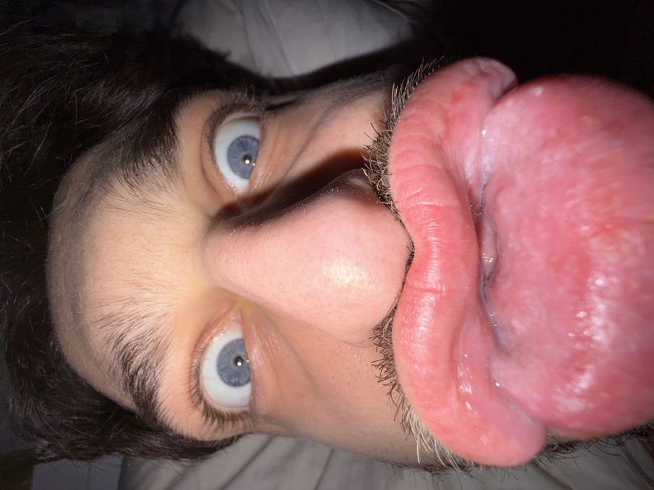 A close-up, wide-angle portrait captures the face of an individual within the city of Unknown, Unknown. The subject exhibits dark hair, prominent eyebrows, and wide-open blue eyes. A dark, short mustache is visible above the upper lip. The lips are exaggeratedly pouted and pushed forward, revealing a portion of a pink, moist tongue protruding below the lower lip. The nose appears enlarged due to lens distortion. The background is dark and indistinct, with faint texture visible in the upper left quadrant, suggesting an indoor setting with limited ambient light. No other individuals or specific objects are identifiable.