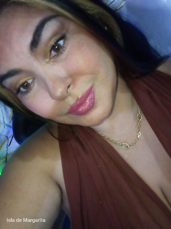 A woman poses closely to the camera. She has brown eyes and dark hair with blonde streaks, glossy pink lips, and fair skin with visible freckles. A gold chain necklace adorns her neck, and she wears a reddish-brown garment that falls to a low neckline. The background is softly blurred, hinting at an interior space. The text "Isla de Margarita" appears in the bottom left corner of the image.