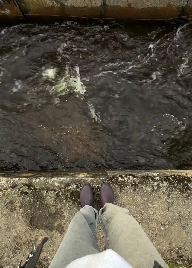 person standing on a concrete ledge above a narrow, dark-colored stream. The person is wearing light-colored jeans and purple rubber boots. The stream is flowing rapidly, with some visible foam and turbulence. The concrete ledge appears to be part of a culvert or similar structure, and there are some markings or stains on the concrete walls beside the stream. The video is shot from a high angle, looking down at the person and the stream.