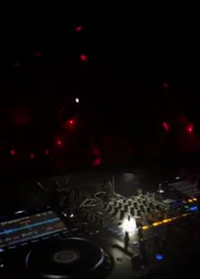 DJ booth in a dark nightclub, with red lights illuminating the crowd. The DJ equipment is in the foreground, with hands visible adjusting the controls. The crowd is visible in the background, dancing and enjoying the music. There are security personnel present in the crowd. The overall atmosphere is energetic and lively.