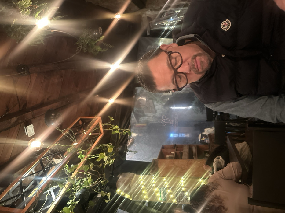 A man with glasses and a black vest stands in a dimly lit interior space. Overhead, exposed light bulbs create a dramatic, radiant effect, highlighting wooden beams, hanging plants, and other fixtures. A glass partition reflects interior lights and appears to show logos. A woman with curly hair sits at a table decorated with string lights, partially obscured by a dark object, adding a warm glow to the scene.