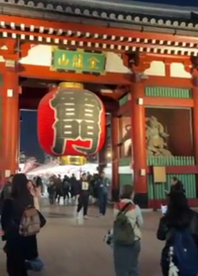 nighttime scene at what appears to be a Japanese temple entrance. The large red gate with green and gold signage hangs a large paper lantern with black characters. Several people walk through the gate, some taking photos with their phones. The area is well-lit and crowded, with more temple structures visible in the background. Most people are wearing casual clothing. The overall atmosphere seems to be a mix of tourism and local activity.