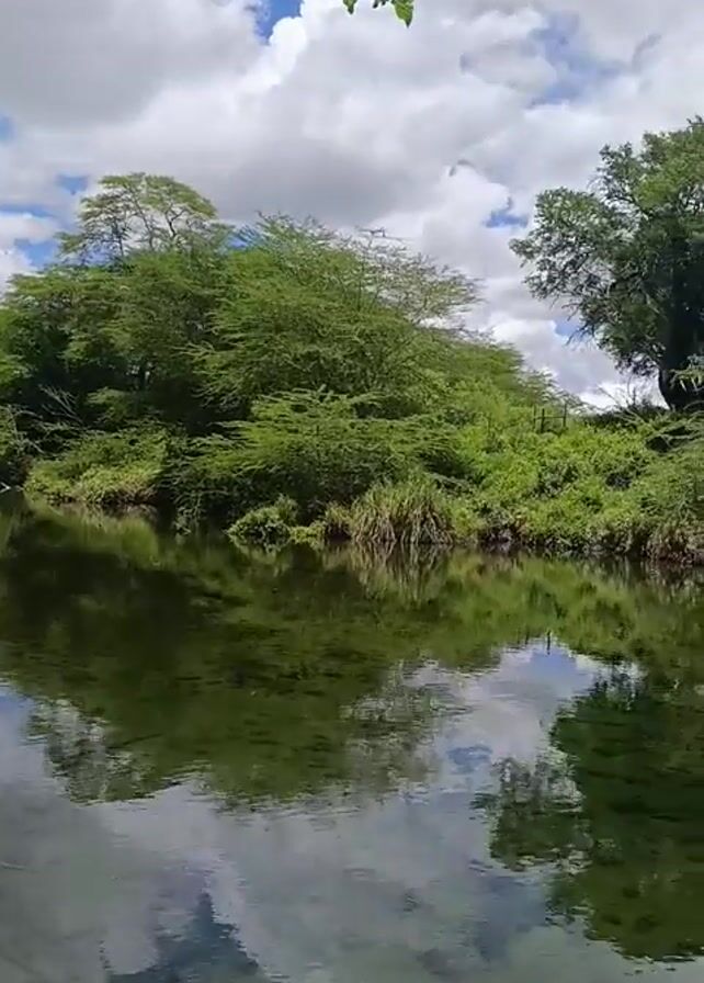 The camera pans across a placid body of water reflecting a partly cloudy sky. Dense green foliage lines the banks of the water. The camera then focuses on a simple shelter with a thatched roof perched over the water. Several people are visible on the shelter, including one person wearing jeans, a dark T-shirt, and a baseball cap who is looking at a mobile phone. The camera then pans back, showing the water and the lush surroundings.