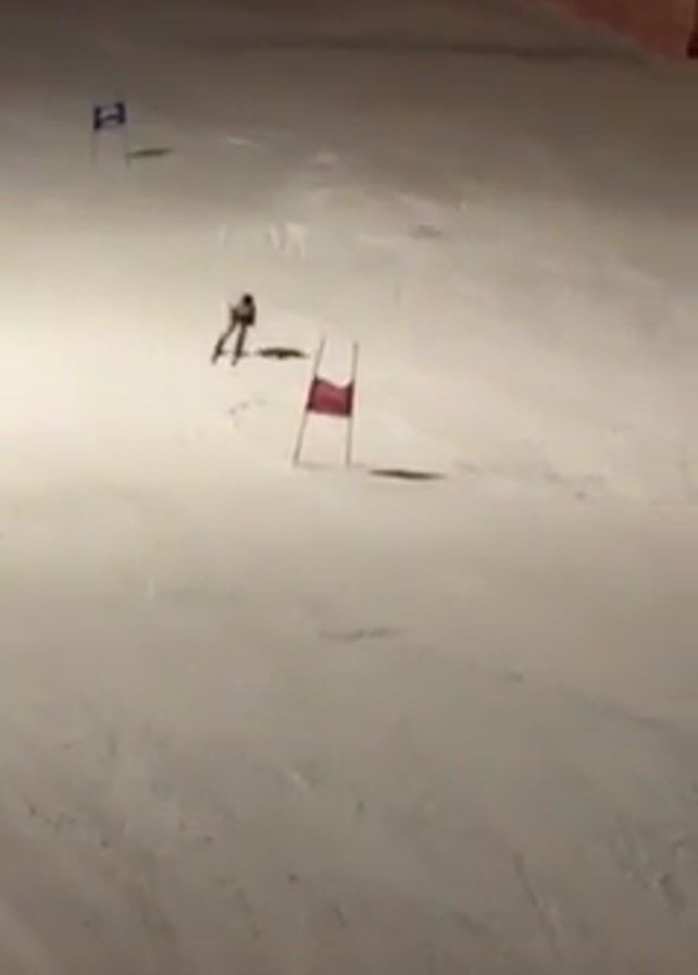 skier moving downhill through a slalom course. The skier wears a dark-colored outfit and skis in a snow-covered environment with several red and blue poles marking the course. The illumination is poor, and the lighting is artificial. The skier makes turns, passing the poles.
