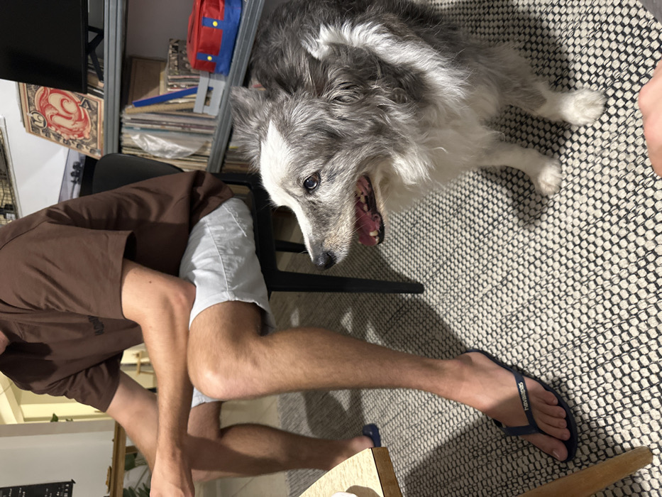 The image displays an indoor domestic scene in Pardes Hana-Karkur, Israel. An adult male is seated, visible from the chest down, wearing a brown short-sleeved t-shirt with a dark logo, light grey shorts, and dark blue Havaianas flip-flops on his bare feet. He is positioned on a dark-colored chair, with his arms crossed. A light-colored wooden table edge is visible to his left. Standing on a light-colored rug with a dark geometric square pattern, a medium-sized dog with mottled grey and white fur is positioned to the right of the seated individual. The dog is looking upwards and to its right, with its mouth open, revealing its tongue and teeth, indicative of panting. In the background on the right, a metal shelving unit holds various items: vertically stored media (books or records), a red and blue Super Mario-themed storage box, a framed piece of art featuring an abstract red and white design, and a partially visible black computer monitor on the top shelf. The background on the left includes a light-colored wall, a black board with white markings, and additional wooden furniture items. The scene is illuminated by ambient interior lighting.