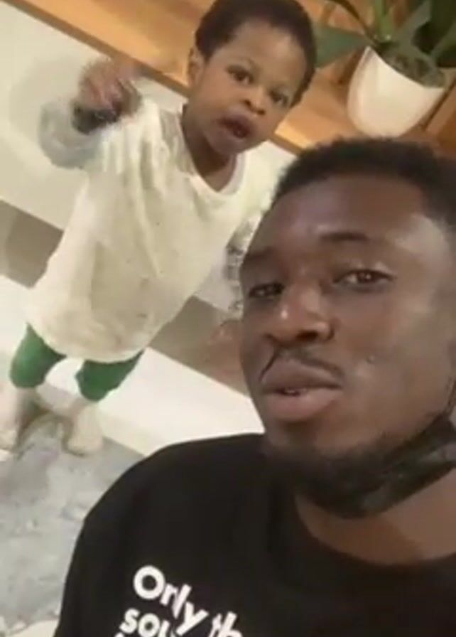 A man and a young boy are standing together in what appears to be an indoor space. The man is in the foreground, holding the camera, taking a selfie video. He is wearing a black t-shirt with white writing on it, and a black face mask is pulled down below his chin. He has short, dark hair and a beard. He is smiling and talking into the camera, saying "I love you." The boy is standing behind him, slightly to the left. He's wearing a light-colored, long-sleeved shirt, green pants, and white socks. He also says "I love you" and makes a kissing face. The background is a light-colored, tiled floor and a wall with a wooden shelf. A potted plant is visible on the shelf behind the boy. The lighting appears to be from overhead sources.