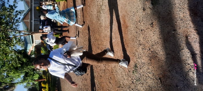 The scene depicts an outdoor environment in the city of Unknown, Kenya, under bright daylight with prominent shadows. A reddish-brown dirt and gravel ground covers the foreground and mid-ground. In the immediate foreground, a female with dark skin and braided hair, wearing a white t-shirt, brown fitted trousers, and white athletic shoes with black accents, walks towards the right. She carries a black crossbody bag across her left shoulder and a light-colored folded garment in her right hand. In the mid-ground, multiple individuals are present. A female in a white short-sleeved uniform shirt, dark skirt, and white knee-high socks is in a running posture, moving towards the right, displaying an emblem on her left sleeve. Behind her, another female in a dark uniform jacket, white shirt, and dark trousers stands. To their right, a female in a light blue and white checkered uniform dress and white knee-high socks is also in motion towards the right. Further in the background, a group of additional individuals, some in similar blue/white uniforms and others in tan uniforms, is visible. A dark vehicle is partially discernible behind the mid-ground figures. The background features a multi-story building with a light-colored facade and a dark roof, surrounded by green trees and manicured shrubs. Elongated shadows are cast from left to right across the ground. The text "police kombo❤💕" is superimposed in white on the bottom-left corner of the image.