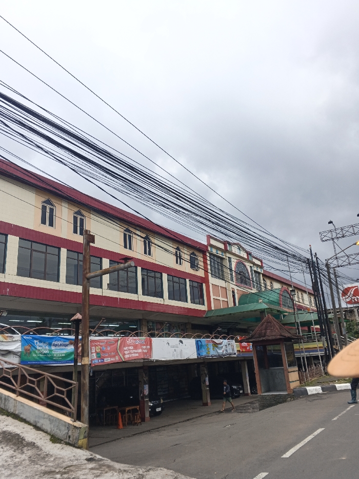 An outdoor urban scene depicts a multi-story commercial building under a cloudy, overcast sky, located in Palayan, Philippines. The building's facade is primarily cream-colored with red horizontal bands, featuring dark-tinted windows on the second floor and smaller, arched-top windows on the upper floors. A central section of the building has a more elaborate design with an arch motif and a green awning extending outwards. Numerous black electrical or communication cables crisscross the upper portion of the frame, spanning diagonally across the sky and in front of the building. The ground level features an asphalt road with a white edge line in the foreground. To the left, a concrete ramp with a brown metal railing ascends towards the building. Below the second floor, an open-air undercroft area is visible, containing tables, chairs, and a dark sedan parked. Multiple promotional banners with text and graphics, including one blue banner mentioning "Rp.1.020.000," are strung horizontally across the lower part of the building's facade. A small, brown, hut-like structure with a pointed roof stands on the right side of the street, near the building. On the far right, a metal pole structure, possibly a streetlight, is visible, partially obscuring a red circular sign. Two individuals are present: one person in a dark shirt and light shorts walks from left to right across the street in the midground, under the building's overhang. A second person, wearing blue pants and holding a light-colored object, is partially visible on the far right edge of the frame, facing away from the viewer.