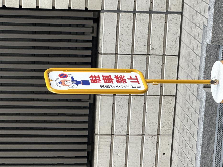 A yellow rectangular sign with rounded corners features a cartoon woman in a blue uniform with a red circle and diagonal line over a car, indicating "No Parking." Japanese text, including "駐車禁止" (Parking Prohibited), is written alongside the image. The sign is mounted on a yellow pole and stands near a building with horizontally stacked gray concrete blocks and vertically stacked, textured concrete bricks. The image is angled, capturing the sign and its surroundings in detail.