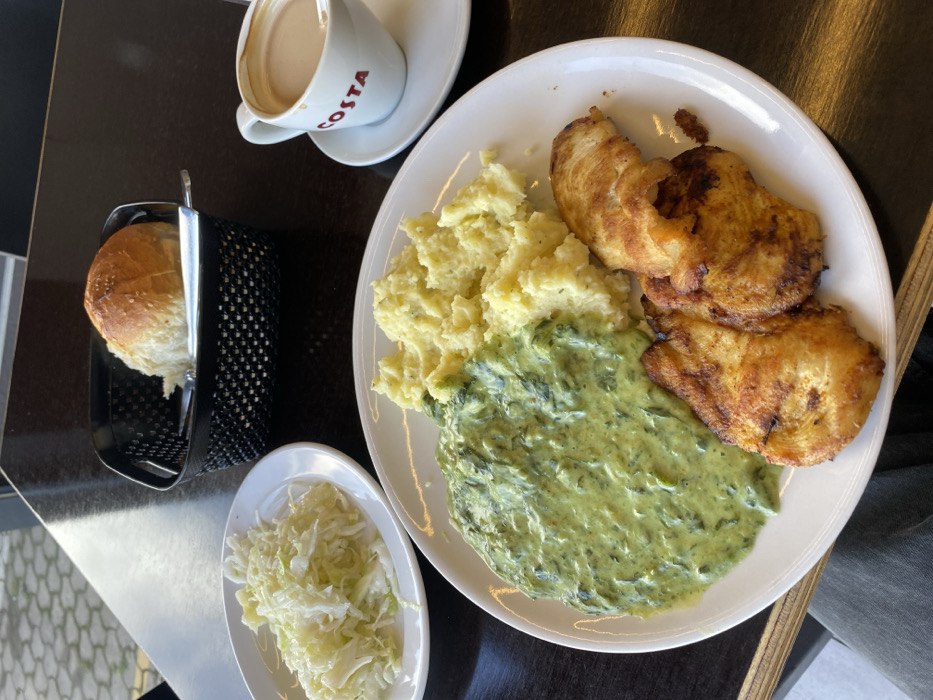 The image captures a meal set on a dark, smooth table within an indoor establishment located in the Palilula Urban Municipality, Serbia. In the foreground, a large white round plate displays three distinct food components: a mass of light green creamed spinach on the left side, a portion of pale yellow mashed potatoes on the upper right, and three golden-brown pieces of pan-fried or grilled chicken on the lower right. To the left of this main plate, a smaller white plate holds a serving of shredded white cabbage salad. Positioned centrally in the mid-ground, a black perforated plastic basket contains a single sesame seed-topped bread roll and a butter knife. To the right, a white ceramic mug, branded with "COSTA" in red, filled with a light brown liquid (likely coffee with milk) and containing a spoon, rests on a matching saucer. A large window in the background reveals an outdoor paved area, suggesting a daytime urban setting. No individuals are present in the frame.