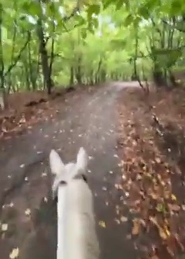 first-person perspective of someone riding a white horse on a dirt path through a forest