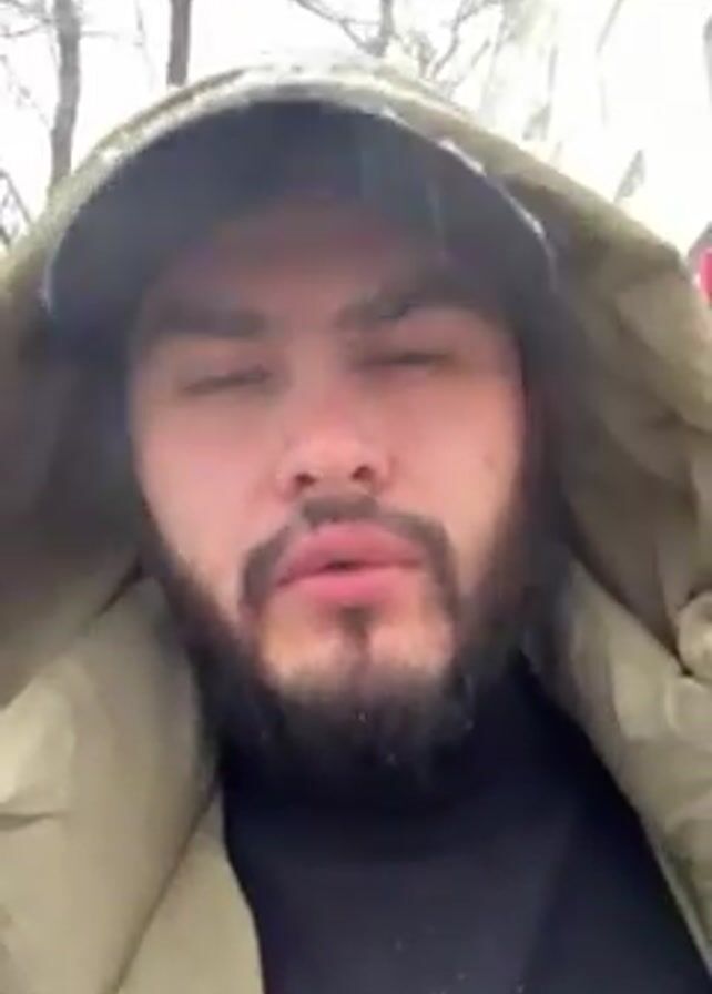 The video starts with a close-up shot of a man with a beard, wearing a hooded jacket and a baseball cap. He says "Hello from Uzbekistan to Africa. It's snow." He turns the camera to show a street with snow and a few cars driving by. There are buildings in the background and trees on the side of the road.