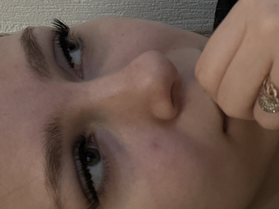 A close-up image displays the upper right torso and face of a female individual, observed from a slightly elevated and angled perspective. Her eyes, appearing light in color, are directed towards the viewer's upper right. Both eyes feature prominent, dark eyelashes. Her eyebrows are brown and well-defined. A small, reddish blemish is visible on her right cheek. Her right hand is raised, with fingers partially obscuring the lower portion of her face and mouth. A gold-toned ring, featuring a decorative, possibly intricate or studded, pattern, is worn on the ring finger of her right hand. The background consists of a light-colored wall with a subtle vertical texture. The specific location within Yekaterinburg, Russia, is not discernible from the visual information presented.