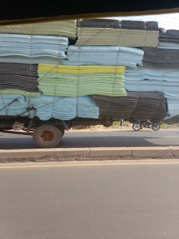 - "The scene in Dadi Riba, Nigeria, depicts a heavily laden truck transporting numerous bundled stacks of foam padding on a paved road during daylight" by FM-yuyTH3, licensed under CC BY 4.0