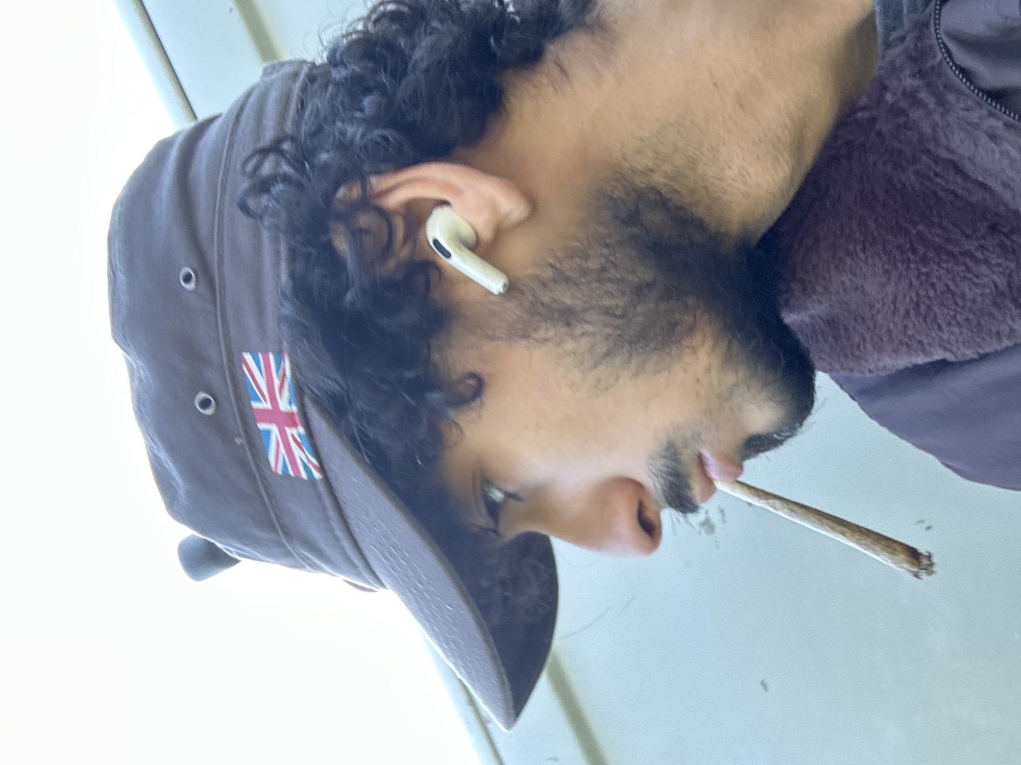 This image, taken in Wissous, France, depicts a male individual in a profile view, facing left. He has dark, curly hair and dark facial hair comprising a beard and mustache. He is wearing a dark brown or charcoal-colored utility cap, which features a Union Jack flag patch on its front. A small, dark cylindrical object is attached to the top of the cap. A white Apple AirPods Pro earbud is visible in his right ear. He is dressed in a dark, possibly purplish-brown, fuzzy or fleecy outer garment over an obscured inner layer. Between his lips, he holds a lit, hand-rolled cigarette or joint, which shows an active cherry at its tip. The background is uniformly light-colored and out of focus, suggesting an outdoor setting against a light-toned surface such as a wall or vehicle.
