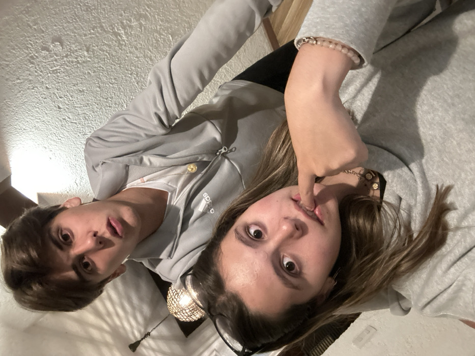 A young couple poses closely for a selfie. The boy, wearing a gray Adidas zip-up jacket, looks wide-eyed at the camera. The girl, partially obscured by the boy, wears a gray sweatshirt and black pants. She touches her upper lip with her index finger, staring intently at the camera. A bracelet adorns her wrist, and a necklace is visible around her neck. The background appears to be an interior setting, possibly a bedroom, with a textured white wall.