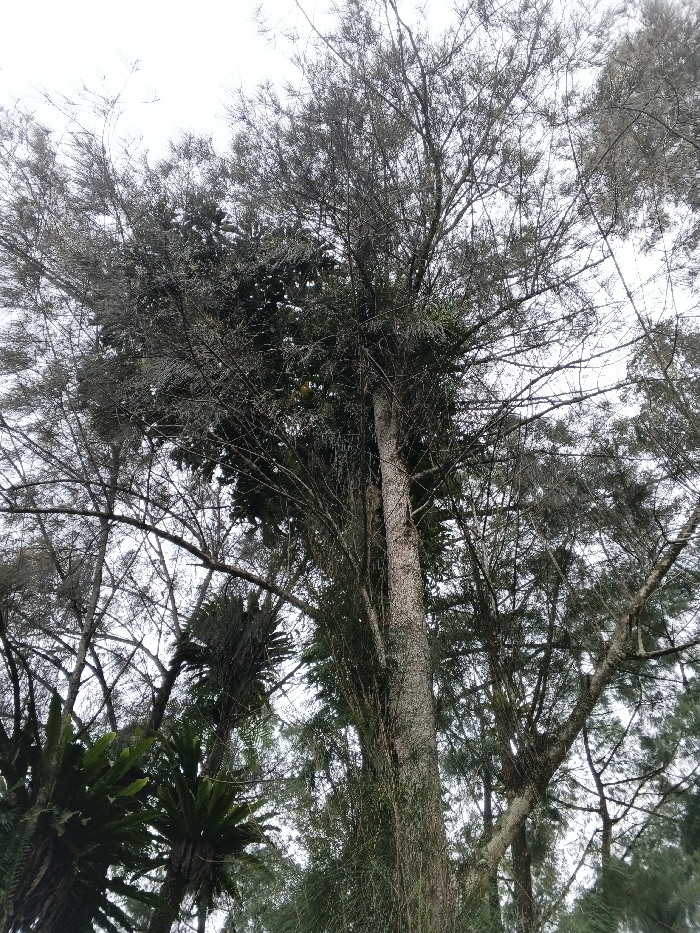 The scene depicts a dense arboreal environment in Trairão, Brazil, viewed from a low angle looking upwards towards an overcast, light grey sky. The foreground and midground are dominated by multiple tall trees. A prominent tree trunk with textured, light grey bark rises vertically on the right side, its upper branches presenting a sparse, branching network with needle-like foliage or thin twigs. Scattered dark green foliage, possibly parasitic or epiphytic, is visible within its crown. To the left and lower center, several large, dark green epiphytic ferns, characterized by their broad, radiating fronds, are anchored to tree trunks and branches. Additional trees with varied densities of dark green foliage populate the background, contributing to a layered forest canopy. No individuals, animals, or man-made objects are present.