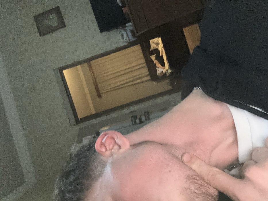 The image displays the right profile of an unidentified individual's head and upper torso within an indoor setting in Bulishi, Georgia. The individual exhibits short, dark, curly hair with a distinct fade haircut, revealing a lighter area above the right ear. Light stubble is visible on the jawline. The right index finger of the individual is pressed against the skin of their lower jawline, near the upper neck. They are wearing a white garment beneath an unzipped black jacket or hoodie, and a thin metallic chain is visible around the neck. The immediate background wall is covered with subtly patterned, light-colored wallpaper. A dark-framed, indistinct picture hangs on this wall to the right. An open doorway leads into an adjacent room. Through this doorway, a dark-colored bed frame with white pillows and a dark, unidentifiable object is visible. Behind the bed, a window is covered by light-colored, pleated curtains. To the right of the doorway, a dark-colored dresser or cabinet supports a flat-screen television and a white object, possibly an iron, along with other small, indistinct items.