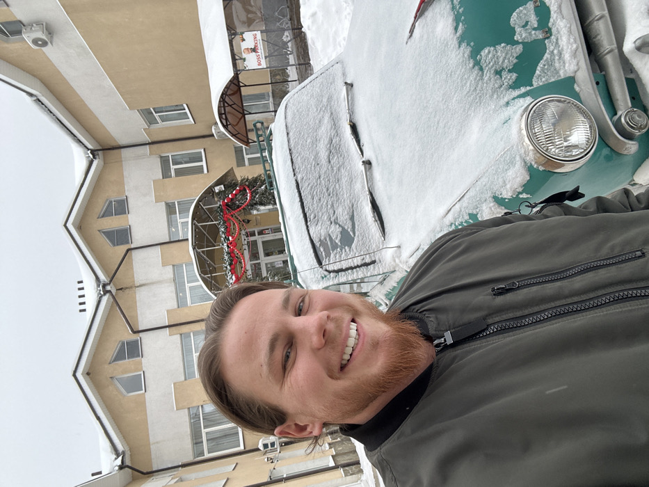 A male subject is depicted in a selfie, smiling, outdoors in a snowy environment in Старт-2 Снт, Russia