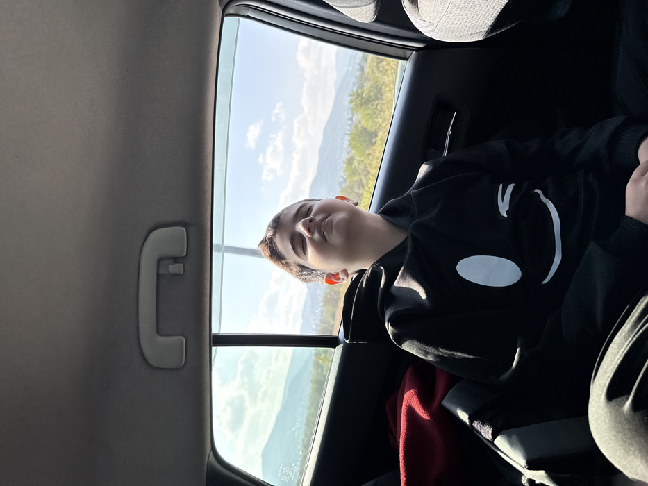 A young male individual is observed in the rear passenger compartment of a vehicle, traveling in the city of Kardenakhi, Georgia. He is seated, wearing a black hooded sweatshirt adorned with a large white winking smiley face graphic on the chest, and dark-colored pants. His eyes are closed, and his head is tilted backward, suggesting he is resting or sleeping. To his immediate left on the seat, a dark backpack is visible, partially obscuring a red fabric item. The vehicle's interior features a grey headliner with a grab handle and dark door panels. Through the windows, a clear blue sky with white clouds is visible above a distant landscape of green and brown hills or mountains, indicative of a rural or semi-rural environment under daylight conditions.