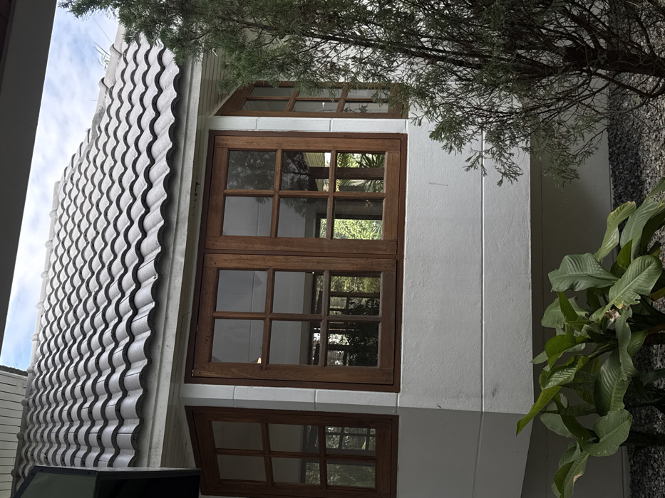 A white building is angled, with a gray, wavy-tiled roof on the left. Two large, wooden-framed windows with multiple panes sit stacked on the side of the building. Above the top window is a smaller, arch-shaped window. A tree overhangs the top window, and leafy plants are to the right of the windows. The white building has vertical indentations. Reflections are visible in the windows.